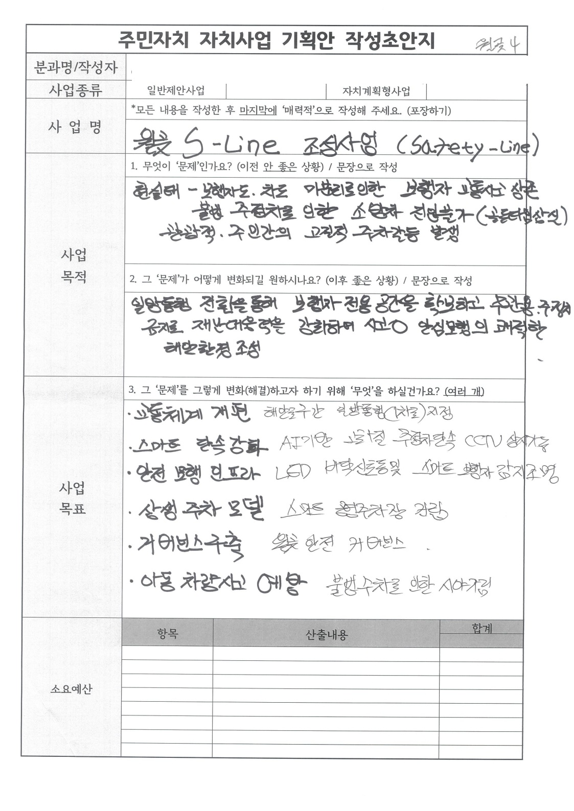 | 사업 내용 | ㅇ 교통체계 개편 : 해안로 구간 일방통행(1차로) 지정 ㅇ 스마트 단속강화 : AI기반 고화질 주정차단속 CCTV 상시 가동 ㅇ 안전보행 인프라 : LED 바닥신호등 및 스마트 보행자 감지조명 ㅇ 상생주차모델 : 스마트 공영주차장 건립 ㅇ 거버넌스 구축 : 월곶 안전 거버넌스 ㅇ 아동 차량사고 예방 : 불법주차로 인한 시야가림 |